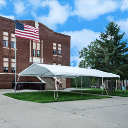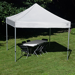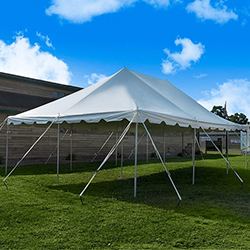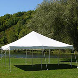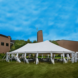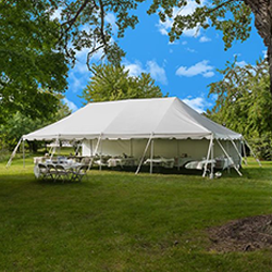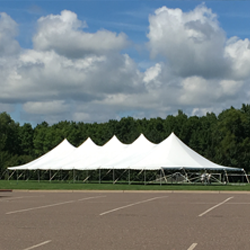 Unlike a rectangular pole tent, this square tent uses only one center pole and allows you to utilize more space for your event. Seats 70-100 people.